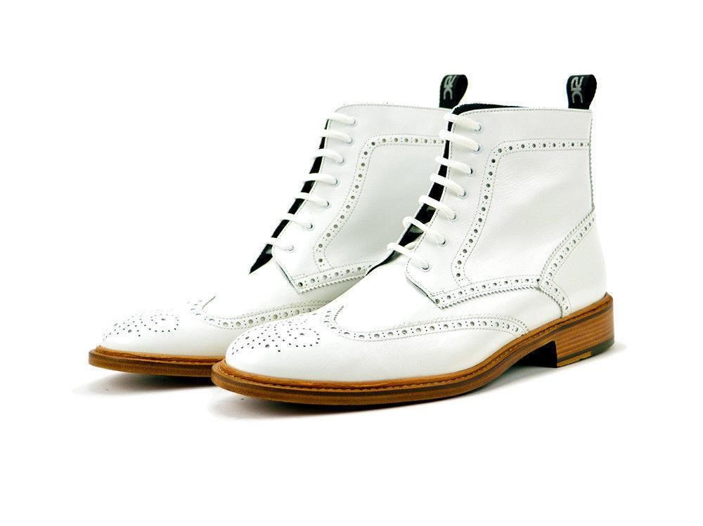 Handmade Men's White High Ankle Leather Wing Tip Brogue Lace Up Boots, Luxury Designer Boots for Men