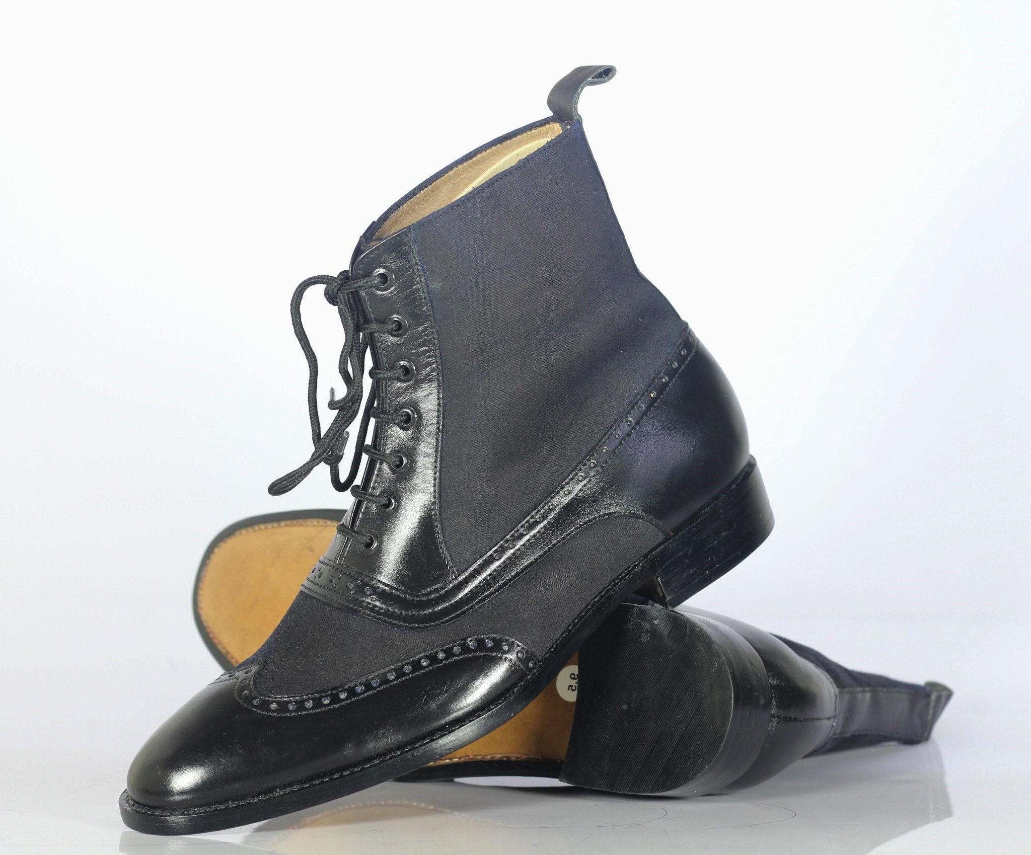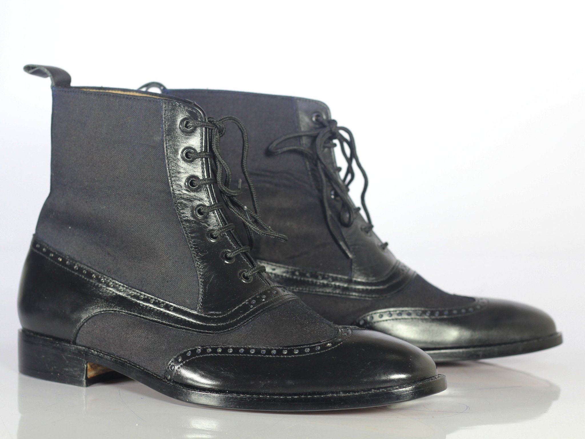 Handmade Men Black Wing Tip Ankle Boots, Men Leather Denim Designer Fashion Boots