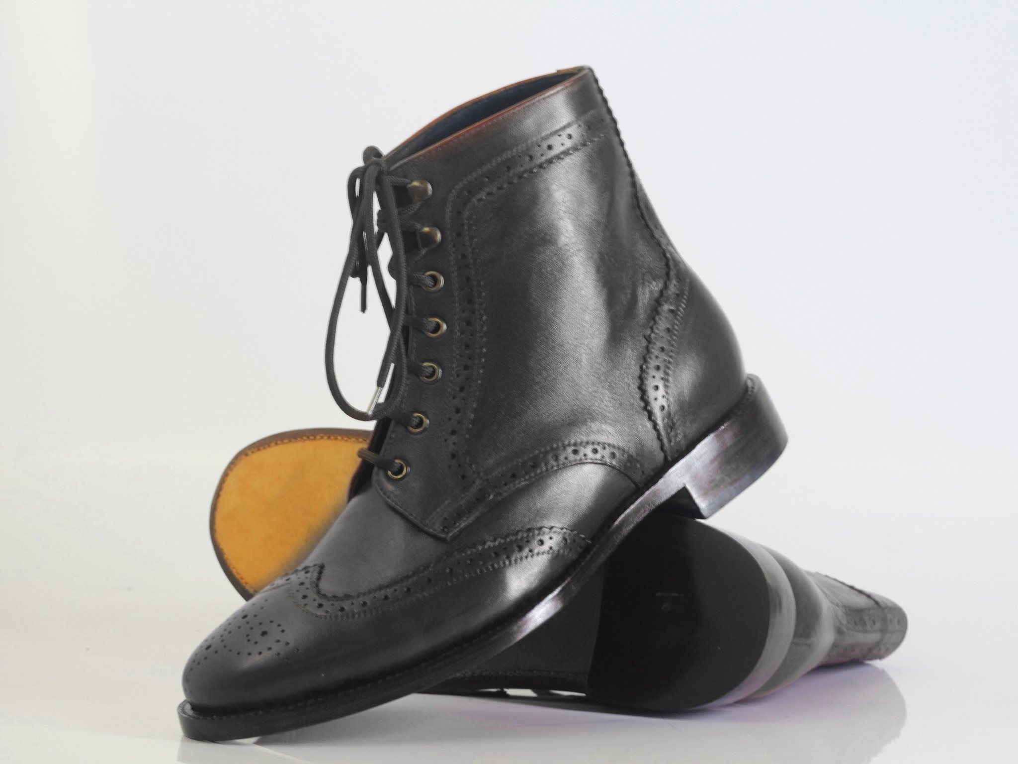 Handmade Men's Ankle High Black Leather Boots, Men Wing Tip Brogue Fashion Boots