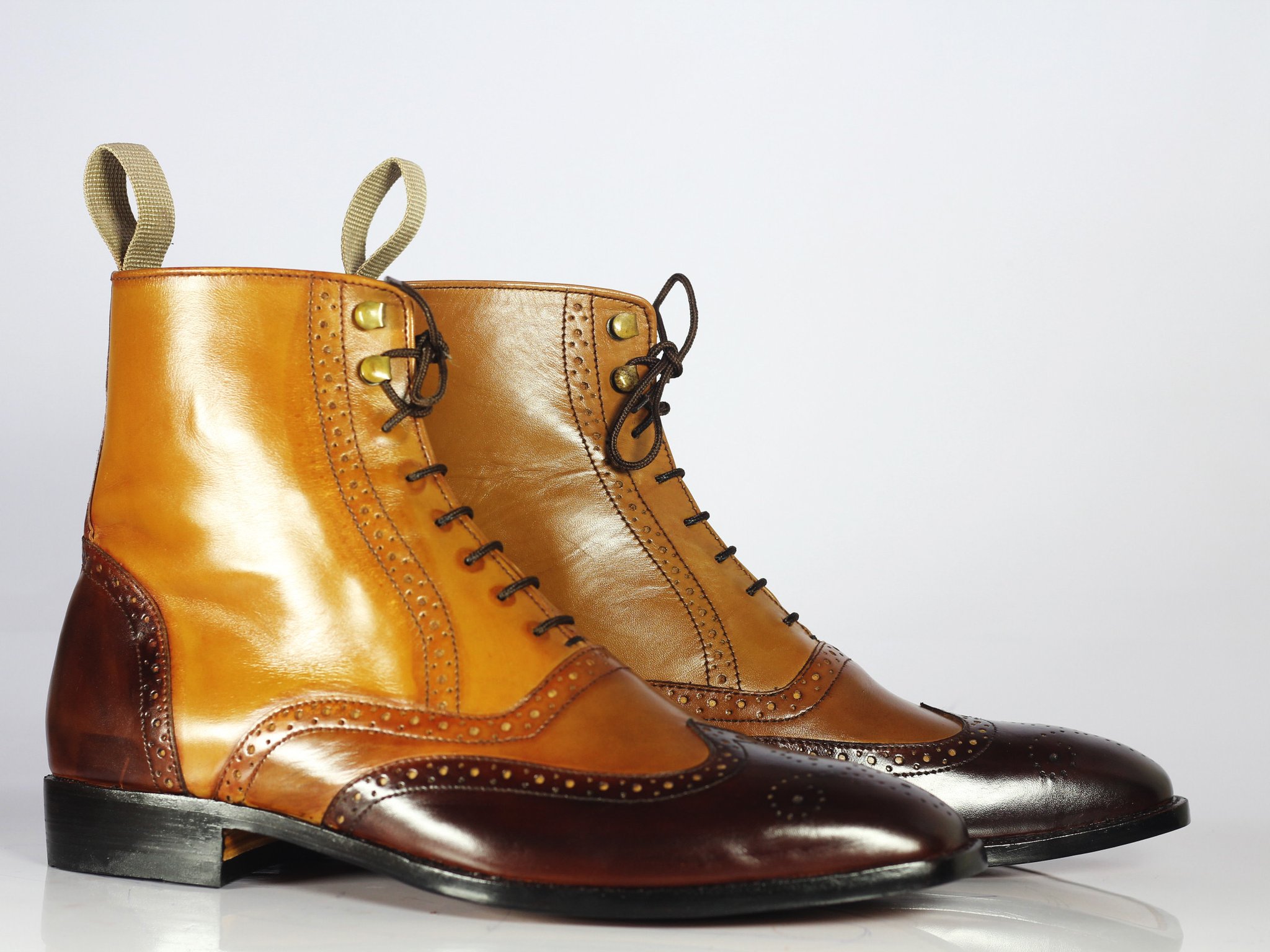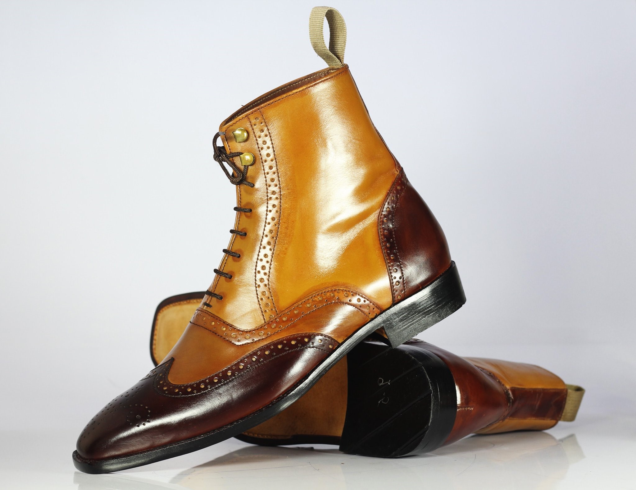 Men's Handmade Two Tone Brown Leather Wing Tip Brogue Boots, Men Luxury Fashion Boots