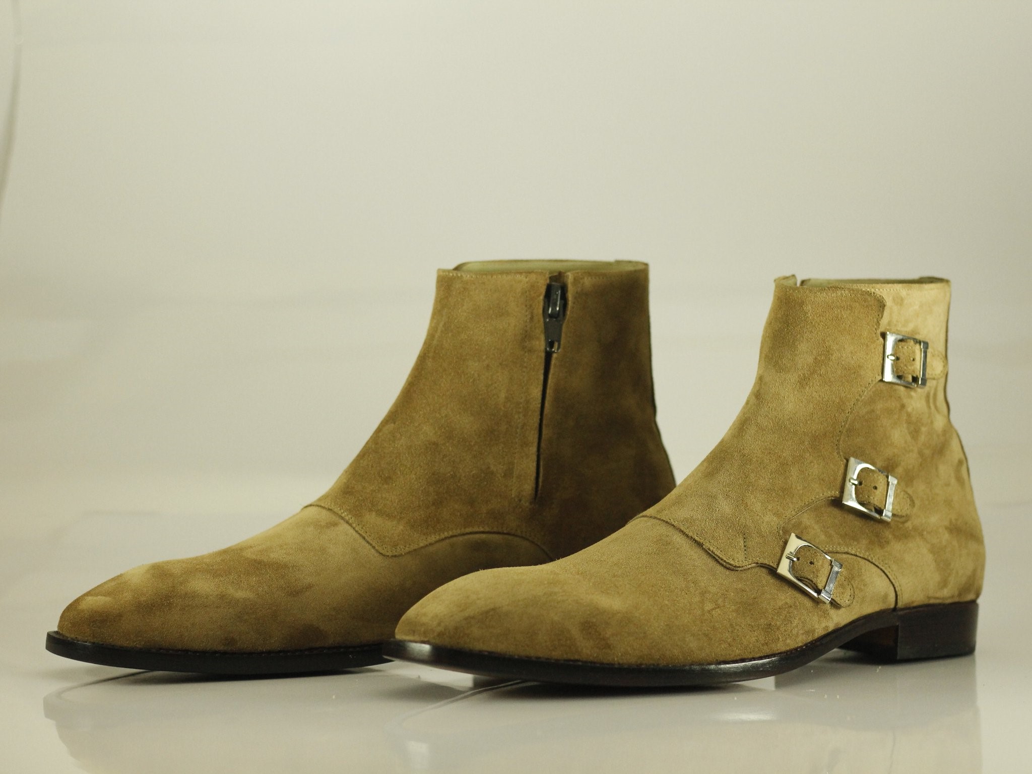 Handmade Men's Beige Suede Triple Monk Strap & Side Zipper Boots