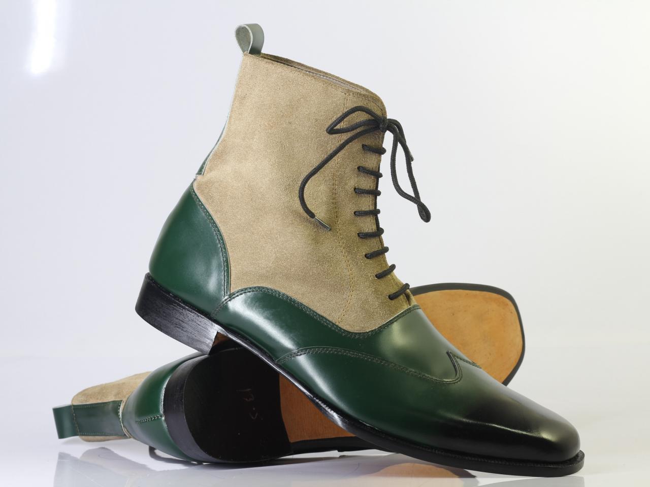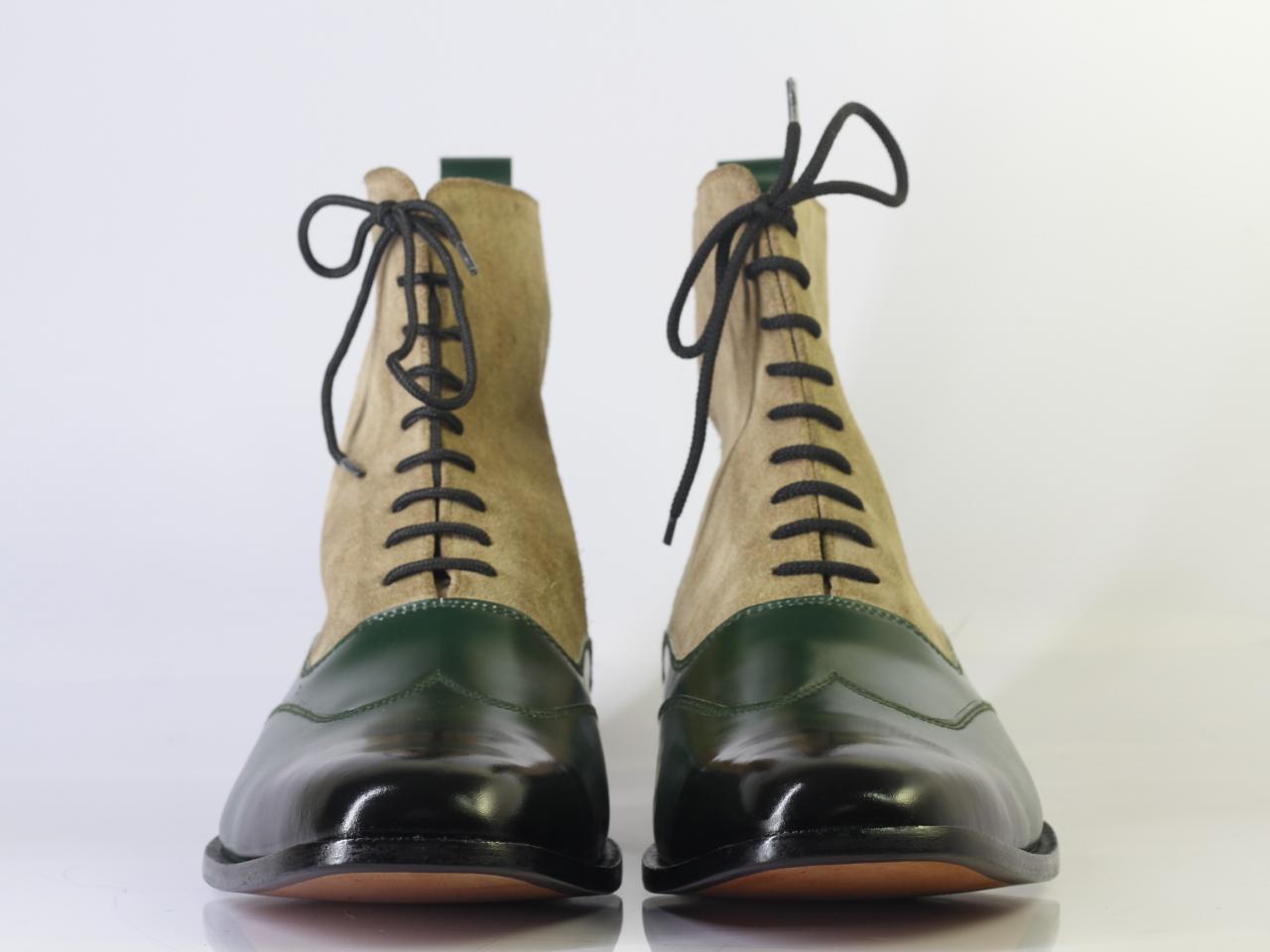 Handmade Men's Green Beige Lace Up Boots, Men Wing Tip Leather Suede Ankle Boots