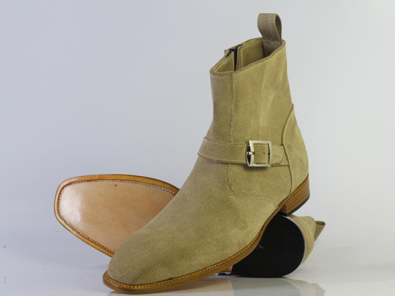 Handmade Leather Jodhpurs Beige Suede Shoes, Men Buckle & Zipper Ankle High Boots