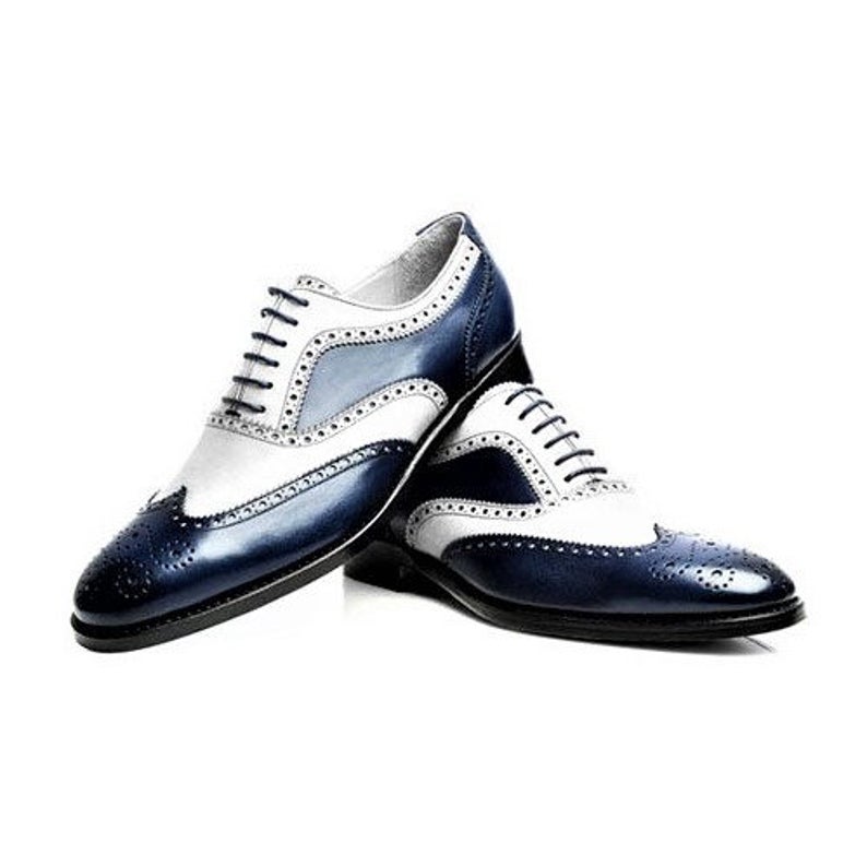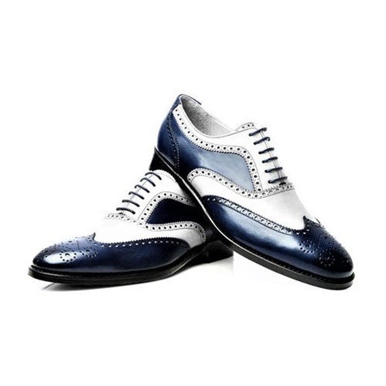 Oxford Handmade White & Blue Leather Wingtip Brogue Shoes for Men, Wingtip Shoes