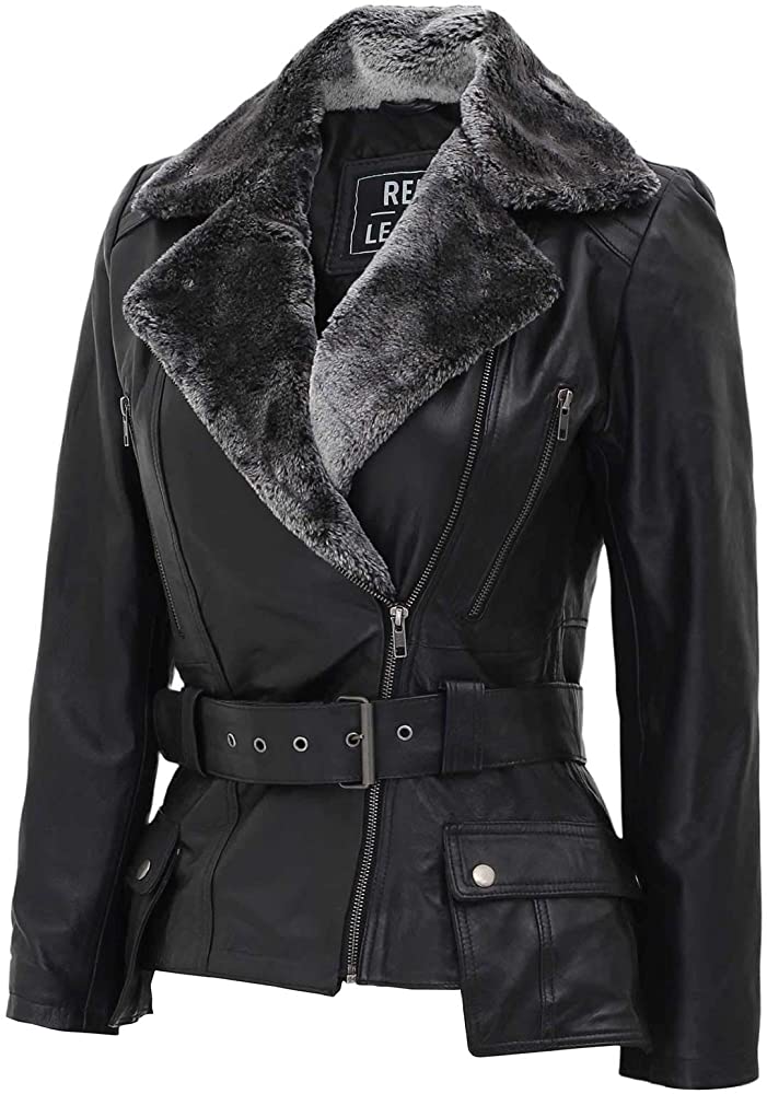 Women Western Fashion Black Leather Fur Jacket Stylish Belted Jackets