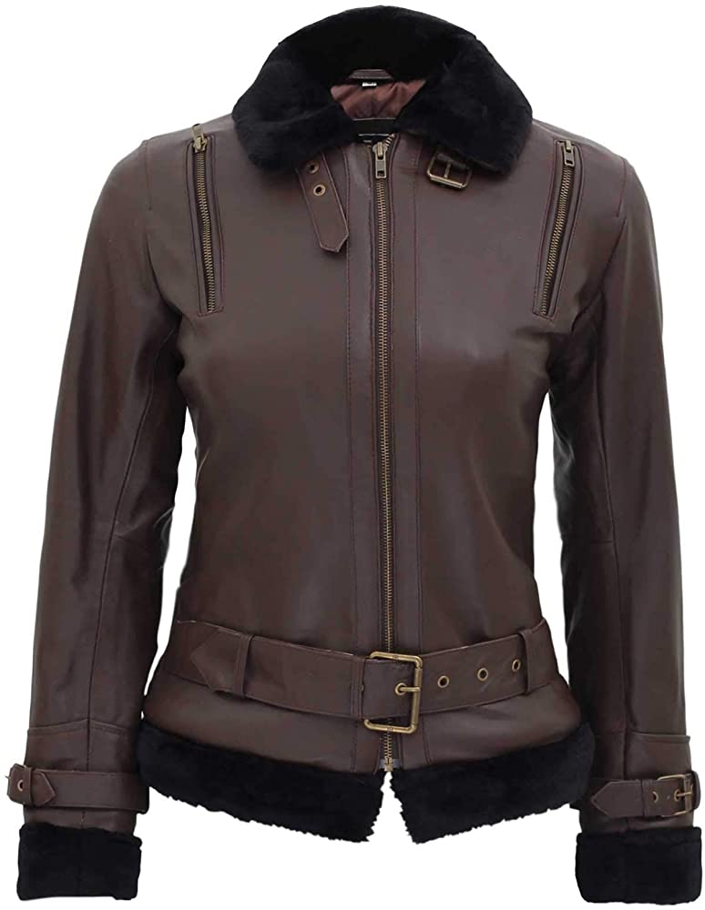 Western Fashion Brown Leather Jacket Women Black Fur Quilted Belted Jacket