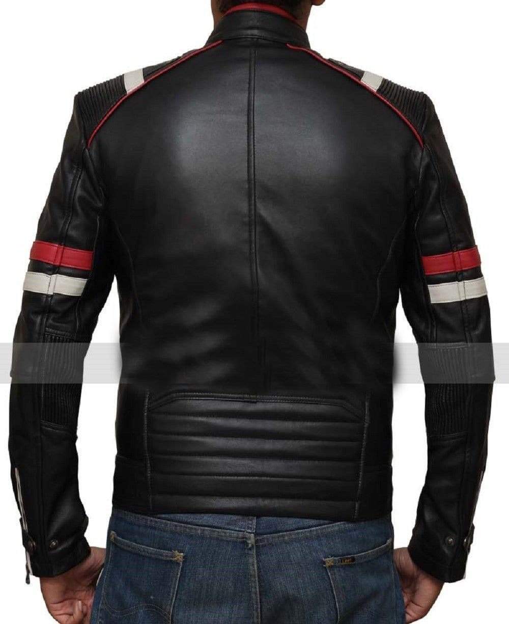 Stylish Black Leather White and Red Stripped Jacket for Mens Biker Jacket