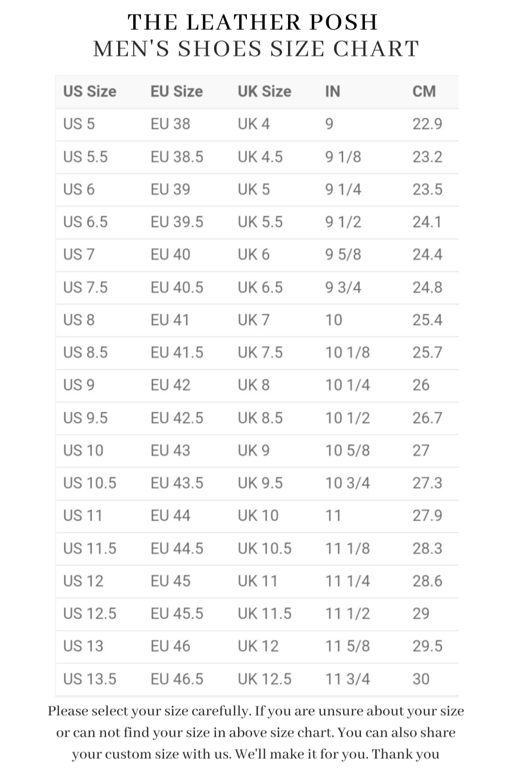 Crafted with premium quality leather. All inner and outer parts including sole are made of genuine leather. To find out your exact US Size, take a look at our size chart. We make - made to order handmade leather shoes and it will take 10 business days to complete. We ship using FedEx / DHL Express or UPS and typically it takes 3 to 7 business days for delivery. Please feel free to contact us if there are any queries about the product.