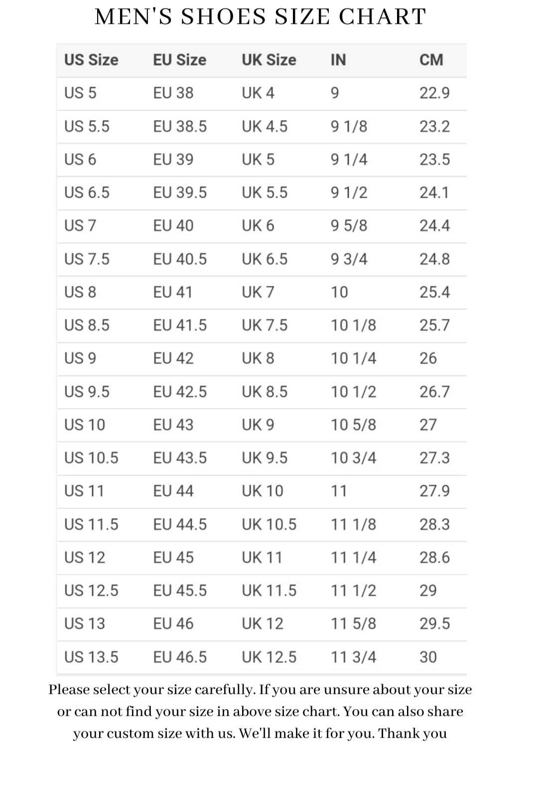 Crafted with premium quality genuine leather. To find out your exact US Size, take a look at our size chart. We make - made to order handmade leather shoes and it will take 10 business days to complete. We ship using FedEx / DHL Express or UPS and typically it takes 3 to 5 business days for delivery. Please feel free to contact us if there are any queries about the product.
