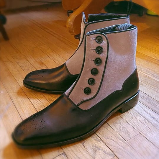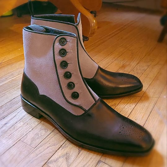 Gray Suede Black Leather Dress Boots for Men's Button Strap Ankle Boots